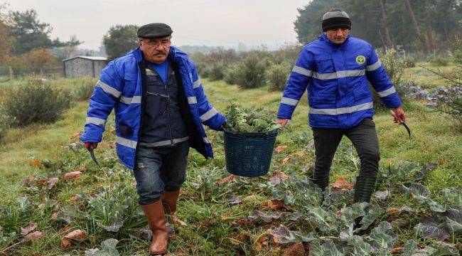 emeklerle yetiştirilen sebzeler, bugün yapılan hasadın ardından Buca Belediyesi