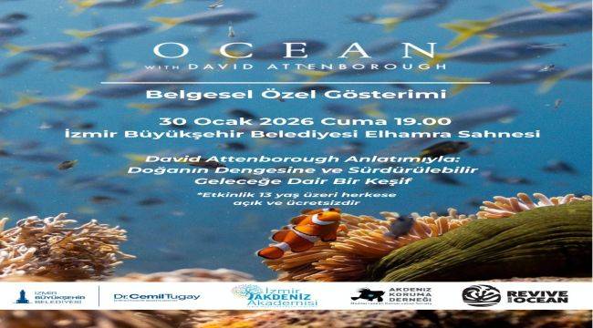 İzmir Büyükşehir Belediyesi, İzmir Akdeniz Akademisi ve Akdeniz Koruma Derneği iş birliğiyle, David Attenborough’nun anlatımıyla hazırlanan Ocean with David Attenborough belgeselini 30 Ocak 2026’da saat 19.00’da Elhamra Sahnesi'nde izleyicilerle buluşturuyor.